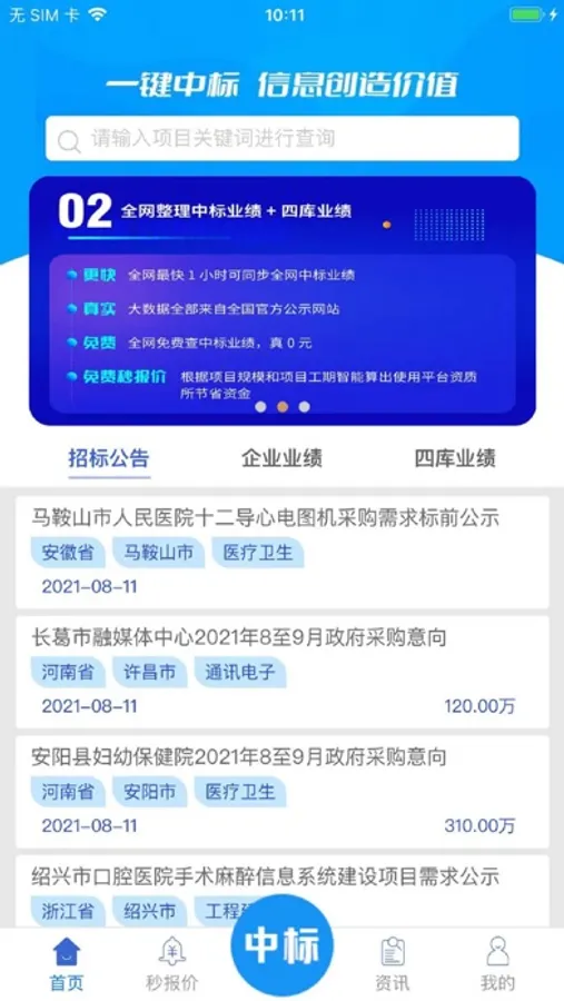 随着信息技术的不断创新,信息化工程建设的不断深入,带动了移动应用的快速发展。为了更好的服务于广大建筑业用户,推出一键中标应用,目前已推出服务包括招投标任务的发布、任务投标、任务中标、任务交付、任务验收与维权、入住商户的产品咨询服务、用户雇佣商户服务,后续将推出建筑业文章的发布、站内聊天等实用功能。在移动互联网高速发展的今天,一键中标APP应用将会在未来不断的完善,为建筑业用户提供更为贴切的服务。