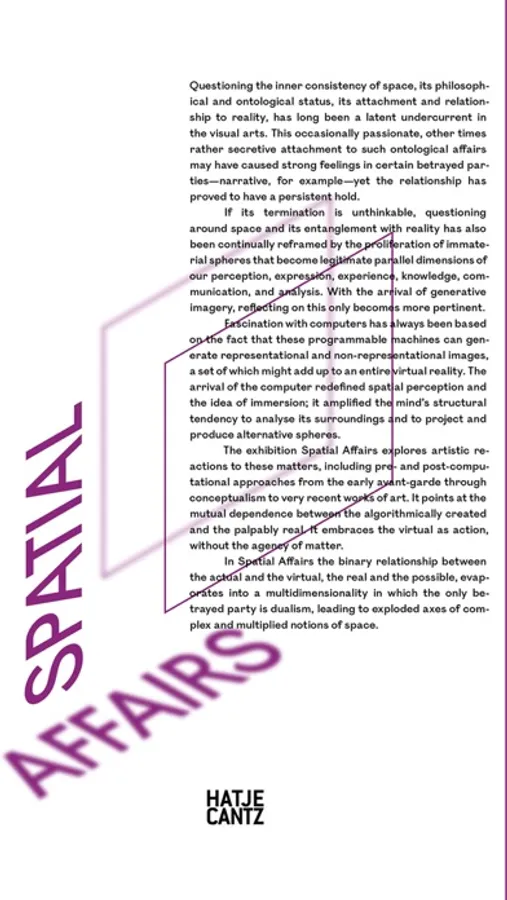 In Spatial Affairs the binary relationship between the actual and the virtual, the real and the possible, evaporates into a multidimensionality in which the only betrayed party is dualism, leading to exploded axes of complex and multiplied notions of space.