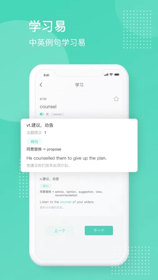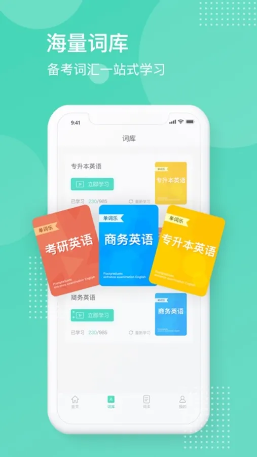 考研英语,商务英语,专升本英语等海量丰富词汇,覆盖您学习成长全过程。同时我们还提供词汇搜索、生词理解、学习进度、我的词本等功能,高效解决您背单词易忘记,提高您的学习效果,碎片化时间学习英语,备考更高效