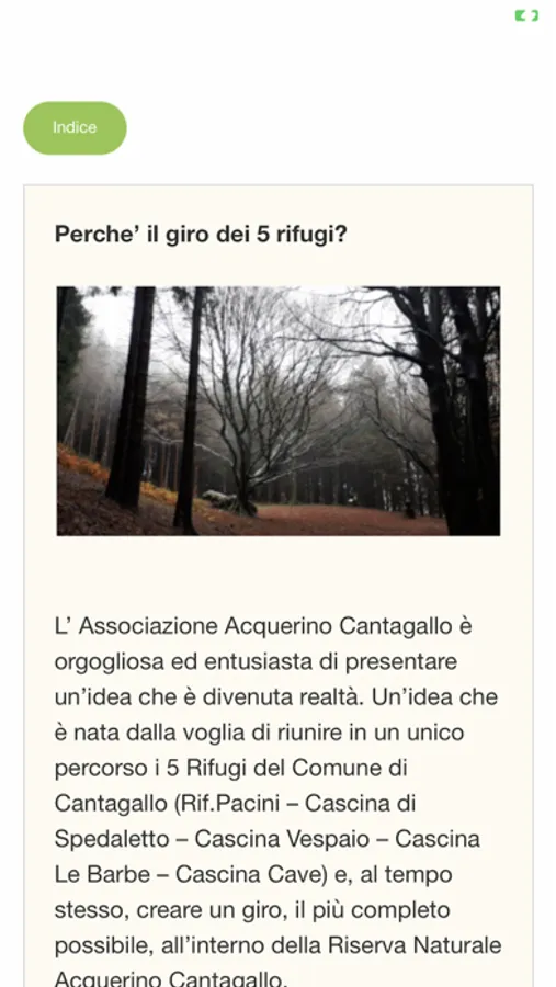 L’ Associazione Acquerino Cantagallo è orgogliosa ed entusiasta di presentare un’idea che è divenuta realtà. Un’idea che è nata dalla voglia di riunire in un unico percorso i 5 Rifugi del Comune di Cantagallo (Rif.Pacini – Cascina di Spedaletto – Cascina Vespaio – Cascina Le Barbe – Cascina Cave) e, al tempo stesso, creare un giro, il più completo possibile, all’interno della Riserva Naturale Acquerino Cantagallo.