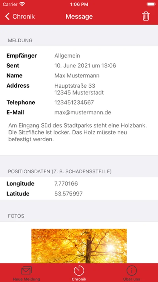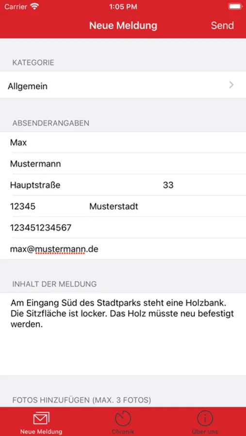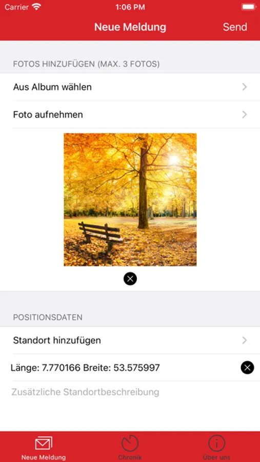 - bei Bedarf Fotos und aktuelle GPS-Positionsdaten hinzufügen