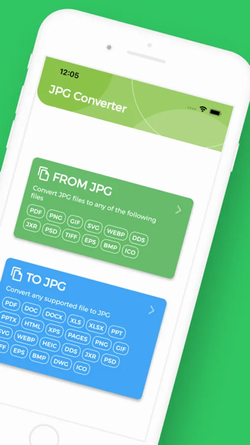 This conversion application allows you to convert any JPG image file to other files like PDF, PNG, GIF, SVG, WEBP, DDS, JXR, PSD, TIFF, EPS, BMP and ICO, it can also convert other files to JPG.