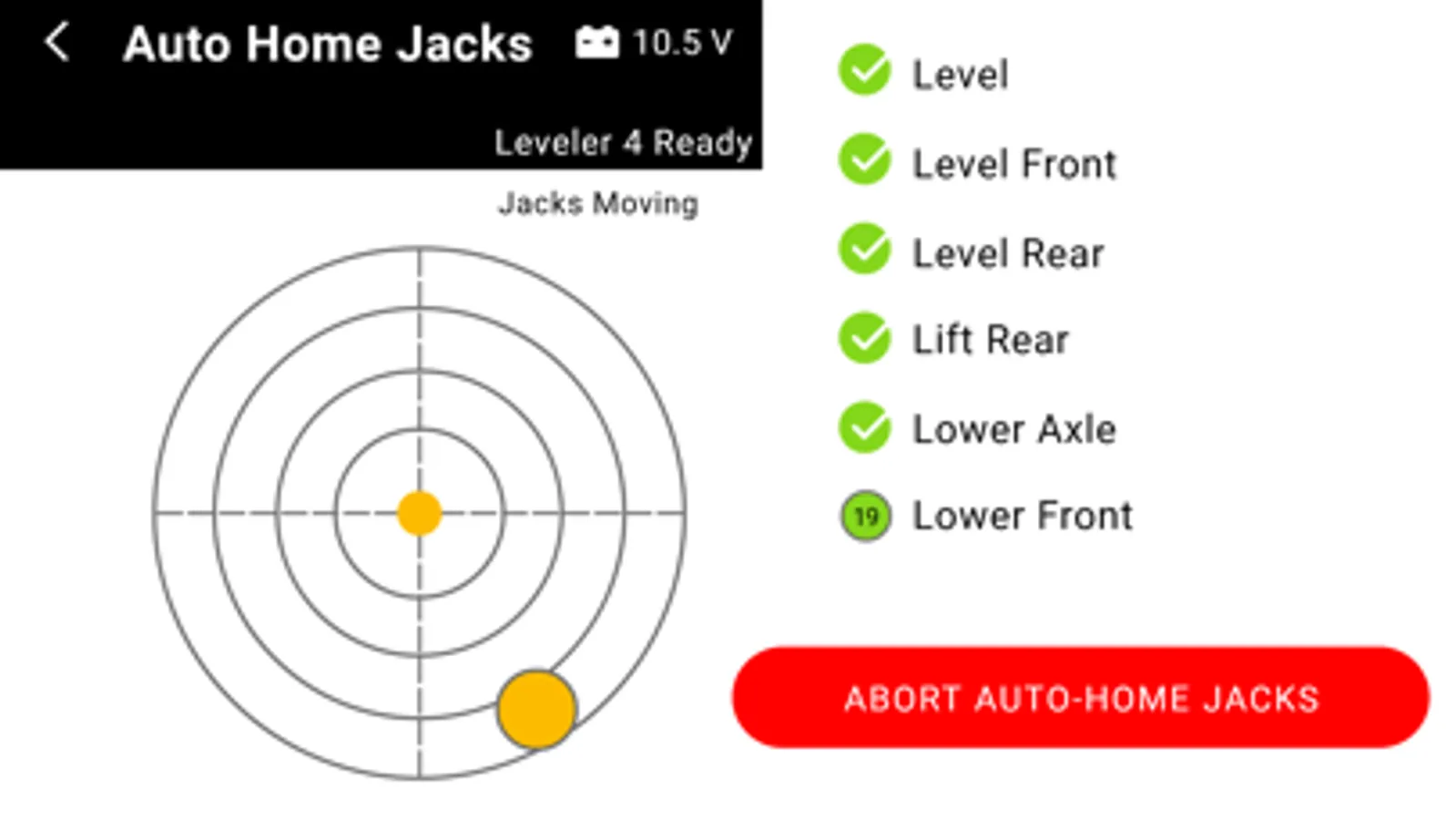 When in Bluetooth® range of your RV, use the Lippert Connect App to automatically level your RV with the touch of a button.
