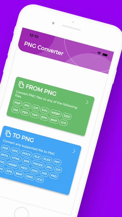 This conversion application allows you to convert any PNG image file to other files like PDF, JPG, GIF, SVG, WEBP, DDS, JXR, PSD, TIFF, EPS and BMP, it can also convert other files to PNG.