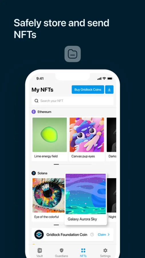 Cryptocurrency has never been easier! Buy and hold popular cryptocurrencies like Ethereum (ETH), Solana (SOL) and Polkadot (DOT), and store your favorite NFTs safely within your self-custody Gridlock Crypto & NFT Wallet. Buy your favorite cryptocurrencies and store them directly in Gridlock – all within a single app. We’re adding coins all the time, so if you don’t find the crypto you want, please let us know and we’ll get to work on it.