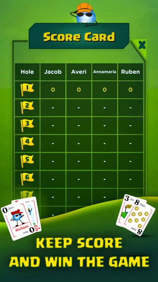 Each player is dealt eight cards with a discard pile and draw pile at the center of the table. To start the game each player flips two cards face up. Moving clockwise each player draws from either the deck or discard pile and has an option to replace one of their face up or facedown cards. If a player does not want their drawn card they may choose to flip one of their facedown cards for their turn. Players work to match vertical pairs of cards to reduce their number of strokes. Just like the game of golf, the person with the lowest score wins the hole.