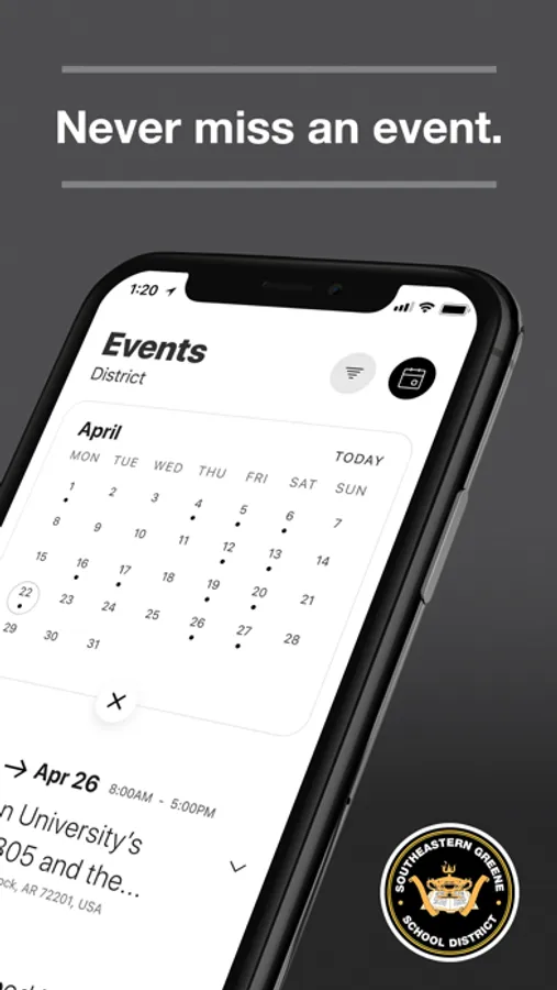 The event section shows a list of events throughout the district. Users can add an event to your calendar to share the event with friends and family with one tap.
