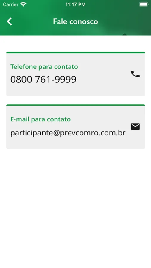 Os dados para os canais de atendimento do PREVCOM RO estão disponíveis no seu aplicativo.