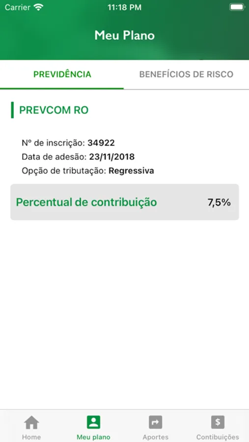 Aqui você confere dados como número de inscrição, data de adesão, opção de tributação do Imposto de Renda e o percentual de contribuição do seu plano.