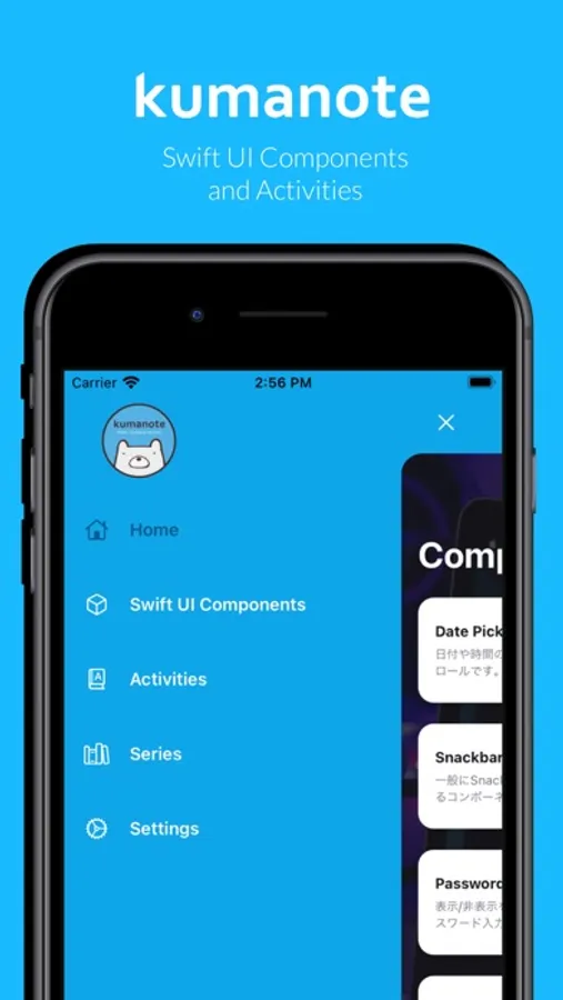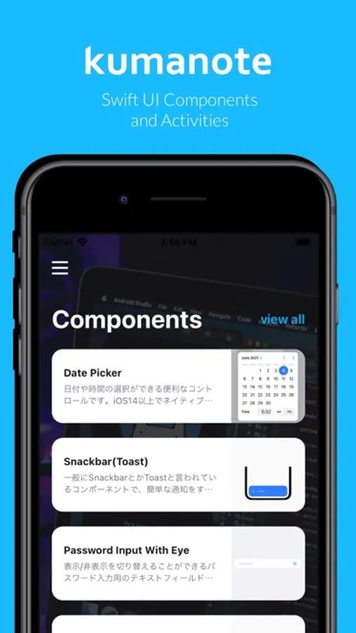 合同会社kumanoteのエンジニアブログアプリです。Swift UI Componentsという画面で合同会社kumanoteでよく使うSwift UIを使った便利なUI Componentの公開を行なっています。実際に動作が確認できるだけでなく、ソースコードも公開しています。