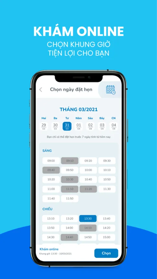 - Chọn lịch hẹn linh động trong tuần, hiển thị đầy đủ các khung giờ trống.