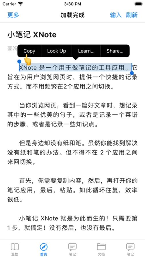 选择文档内容后,先拷贝,然后通过“记一笔”按钮,来做笔记。