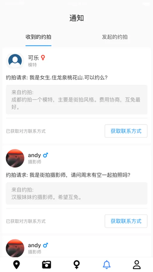 约拍互免是一款刚上线的约拍App,希望为广大摄影爱好者提供一个免费的约拍平台。你可以浏览同城的约拍动态。既可以发布约拍,约模特、约摄影师。也可以对感兴趣的模特点击“约拍她”,并附上你的联系方式。当她收到约拍请求,便可以获取你的联系方式。