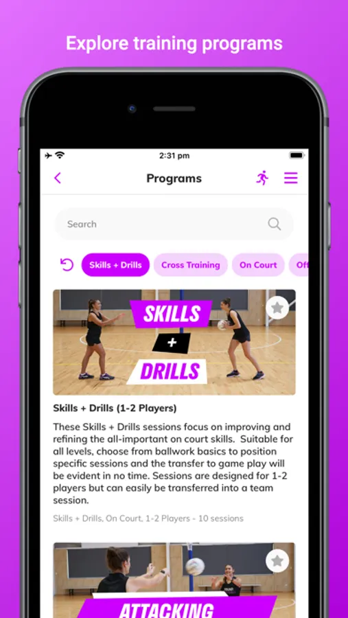 Take your game to the next level with our Programs, Sessions and Skills + Drills library. Over 100 high quality, professional training sessions at your fingertips. Off court, on court, cross training, skills + drills, team strategies, footwork, attack and defence programs - we have you covered with a complete set of individual, small group and team focussed sessions.