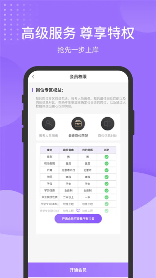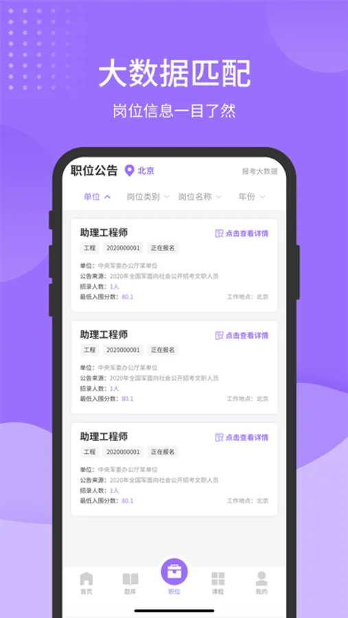 军队文职考试题库根据用户简历通过大数据算法,精准匹配适合用户的岗位。也是方便用户了解自身定位,择业参考。