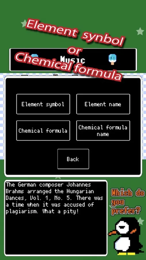 "Chemical Rhythm" is a game that allows you to memorize elemental symbols and chemical formulas while enjoying the game by solving the questions one after another to the rhythm of classical music.