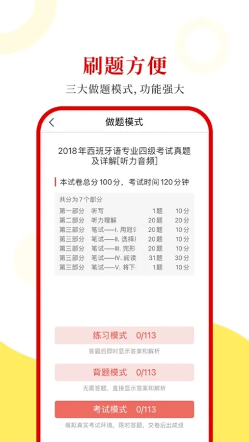 专为西班牙语专业四级考试精心准备的考试配套题库,每一道试题都有答案解析,为考试提供了充分的复习准备,可随时随地学习练习,支持手机、平板多端同时使用。