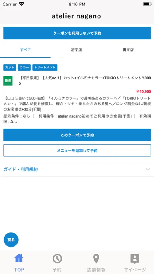 お得なクーポンが配信されます。ネット予約時にクーポン利用での予約も可能なので来店時もスムーズに施術頂けます。