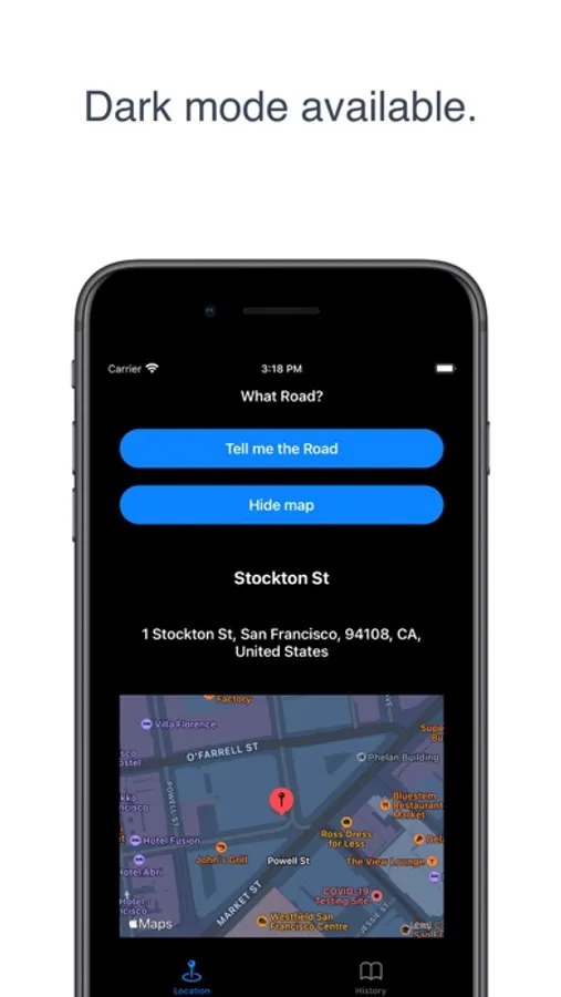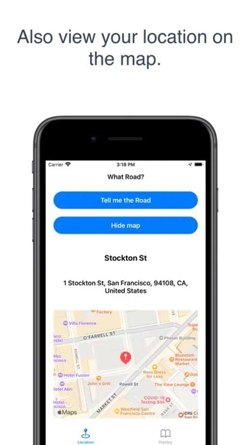 With WhatRoad you can easily find which road you are located on with one tap of a button! If you move locations just press the 'Tell me the Road' button and your location will be updated. You can view your location by displaying the road name or displaying where you are on the map.