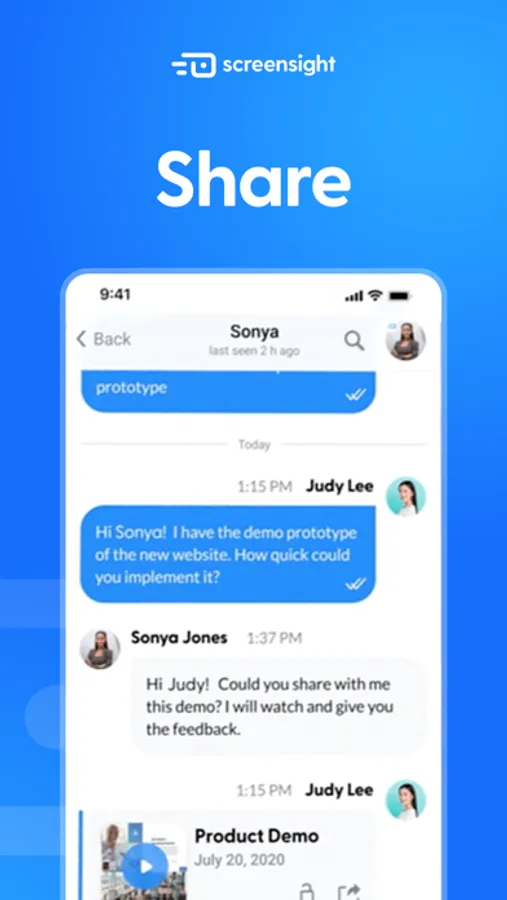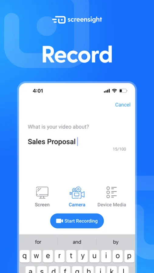 Sell smarter with ScreenSight. ScreenSight is the modern sales messaging tool that allows you to create, share and track videos. Create engaging presentations and screen recordings with camera overlay, share your videos instantly, and track audience engagement.