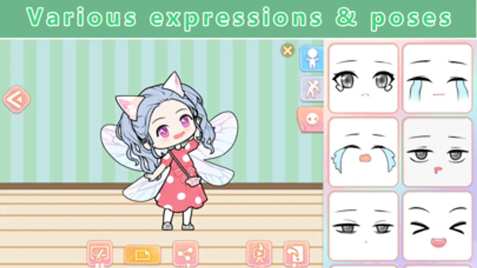 Style selection-become a character maker! Lots of customization options! Change the doll's clothes, hair and color scheme, from hair to eyes, from clothes to shoes, everything can be customized to make your personal dolls style truly shine. Personalized avatar stickers make your own character! With cute dolls, expressing yourself has never been easier!