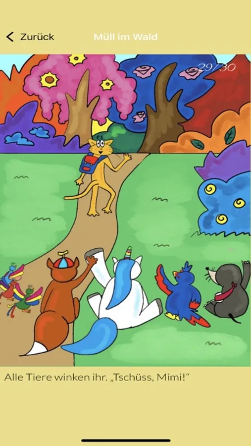 Die App enthält E-Books für Kinder und ihre Eltern. Die Kinder können durch die Seiten der Geschichten blättern und sich dabei die Geschichten von Mimi anhören. Am Ende von jedem E-Book gibt es eine Seite mit Spielen und Fragen zu der Geschichte.