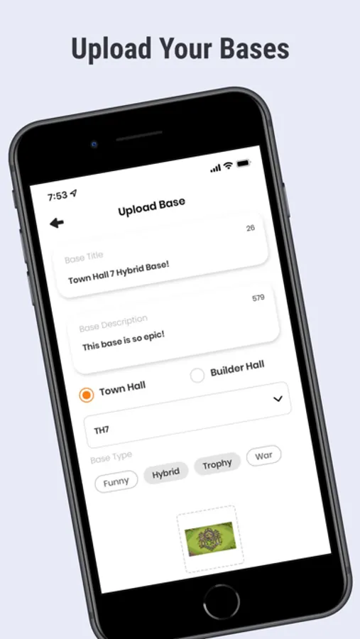Base design tags like: Hybrid Base, Trophy Base, Farming Base, Fun Base.
