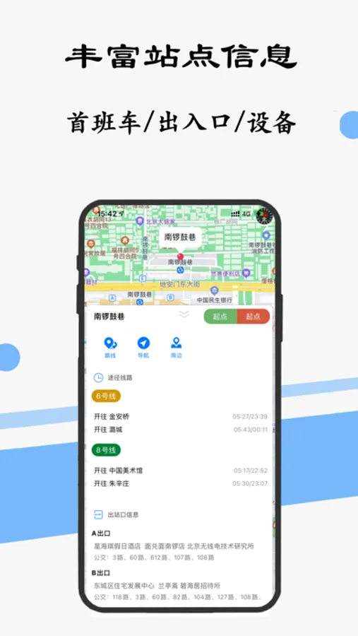 【站点详细信息】提供丰富的站点信息,包括首末班次时间、出入口周边信息及设施等,让您出入更方便。