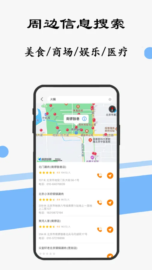 【周边兴趣点搜索】根据站点,能搜索站点的周边生活、娱乐、医疗、学校、商城等设备环境,包括距离,电话地理位置等。