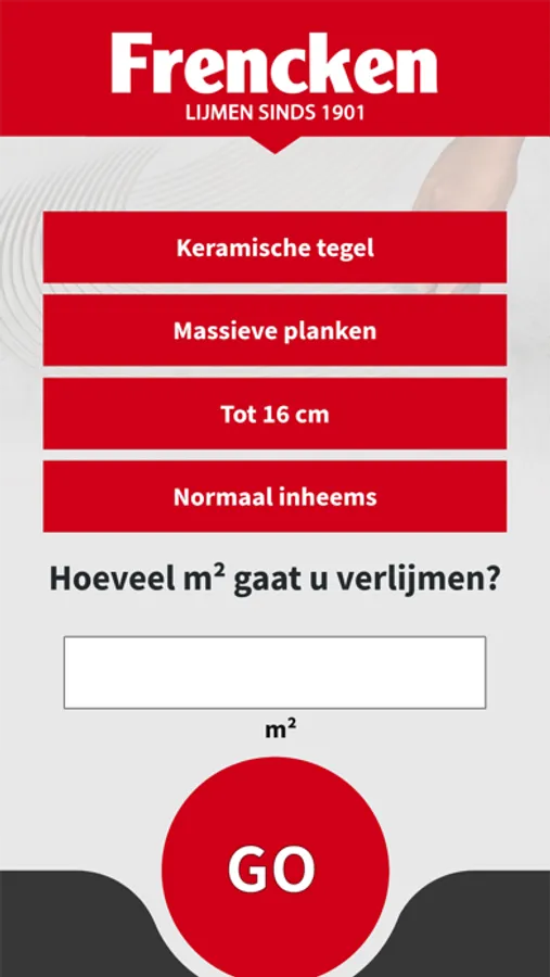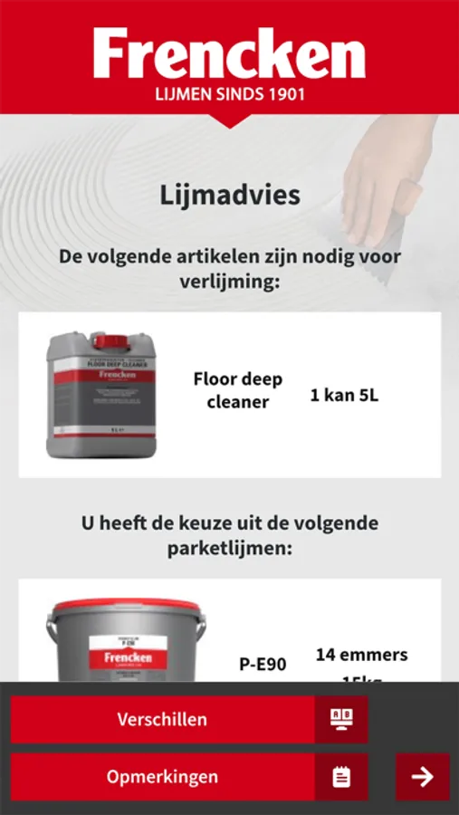 De lijmwijzer app van Frencken laat je eenvoudig een aantal stappen doorlopen en geeft automatisch een lijmadvies afgestemd op de keuzes die je gemaakt hebt.