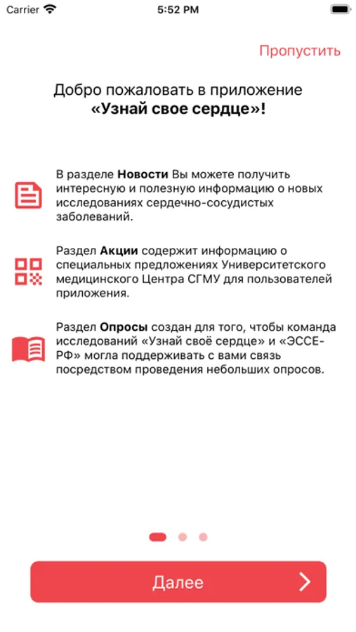 Мобильное приложение «Узнай своё сердце» создано для поддержания двусторонней связи между исследовательской группой и участниками исследований «Узнай своё сердце» и «ЭССЕ-РФ-3», проведенных на базе ФГБОУ ВО СГМУ (г. Архангельск) Минздрава России (далее – СГМУ).