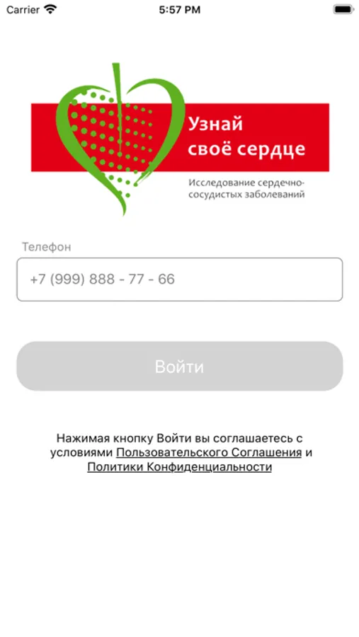 Перед авторизацией в Приложении просим участников исследований «Узнай своё сердце» и «ЭССЕ-РФ-3» внимательно ознакомиться с Пользовательским соглашением и с Политикой конфиденциальности.