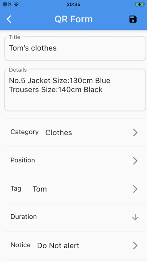 You can use QRForm to Manage clothes in a box, food in a fridge, files in a box, or anything you want to relate to a QR code. You can print out multiple pieces of QR code, cut it, then paste it to the outside of a box. Scan it by the App so you can input some information including title, details, category, position, tag, pictures.You can check the content everywhere and anytime, because the details is saved in your mobile and you don't need to open a box or case to do that. You can also sync data over multiple devices if you if you login as the same user. You can use it offline or online. You can also set a notification to remind yourself in some cases.