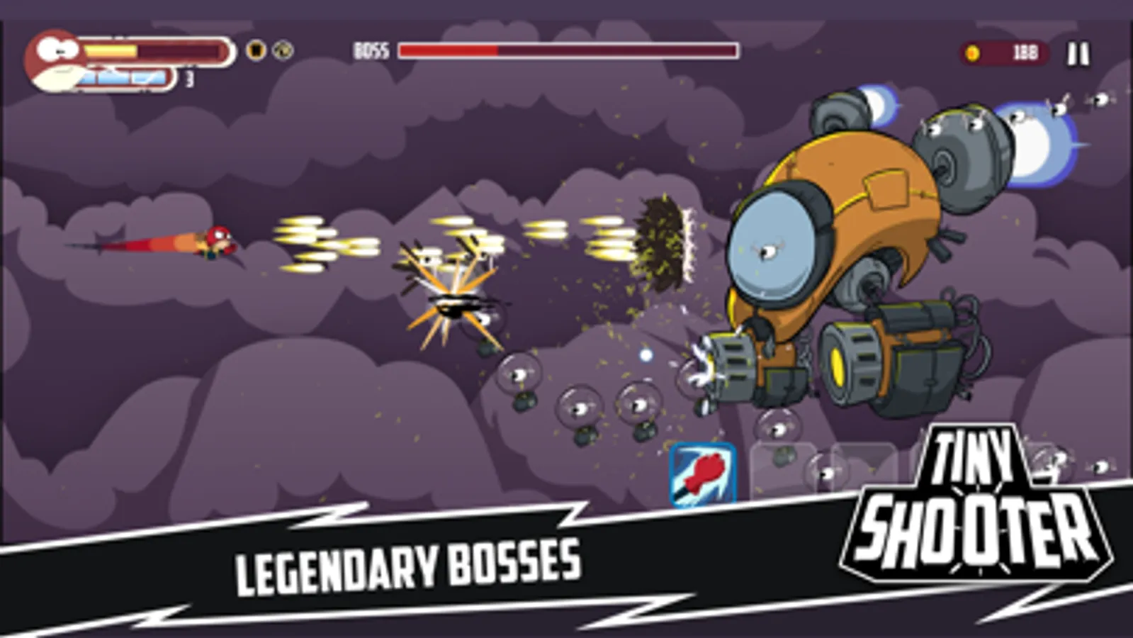 It has a simple control which will allow you to swiftly move just by dragging the finger on the screen. Double tap and watch the tiny hero shooting powerful projectiles in all directions. You will receive bombs, shields, and life ups throughout the game!