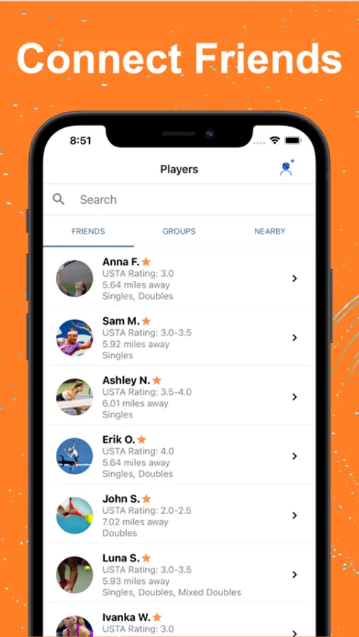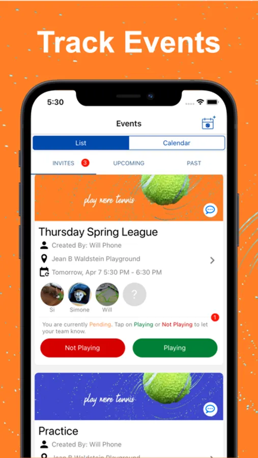 The Tennisphere App lets users find and connect with local players, organize players into Friend and Group Lists, schedule Events and Teams, and foster tennis in their communities.