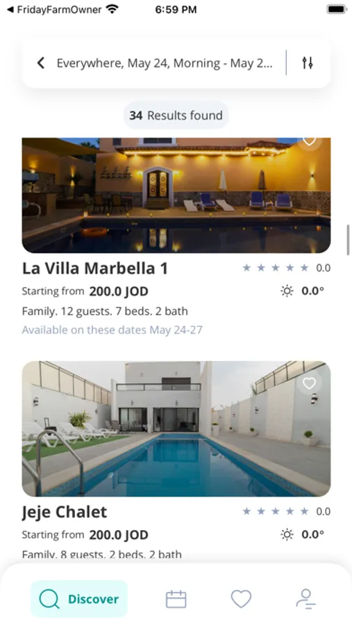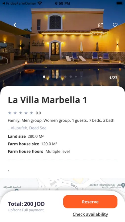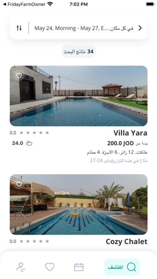 يمكنك التطبيق من استئجار مزرعة لحجز إقامة ممتعة في المكان الأمثل لك وفق تفضيلاتك في ربوع الأردن، حدد وجهتك واستعرض الخيارات المتاحة سواءاً في يوم جمعة أو أي يوم في الأسبوع