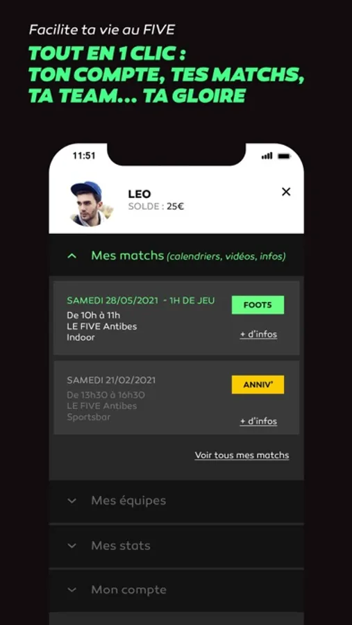 - Des accès plus simples à tes matchs, tes vidéos, tes stats : le profil joueur a été revu, tu peux maintenant accéder très simplement à tes expériences passées ou futures au FIVE. En cliquant sur ton profil, en bas à droite sur mobile ou en haut à droite sur ordinateur, tu peux facilement retrouver ton prochain match, ton dernier match, tes équipes, et toutes les infos relatives à ton expérience sportive.