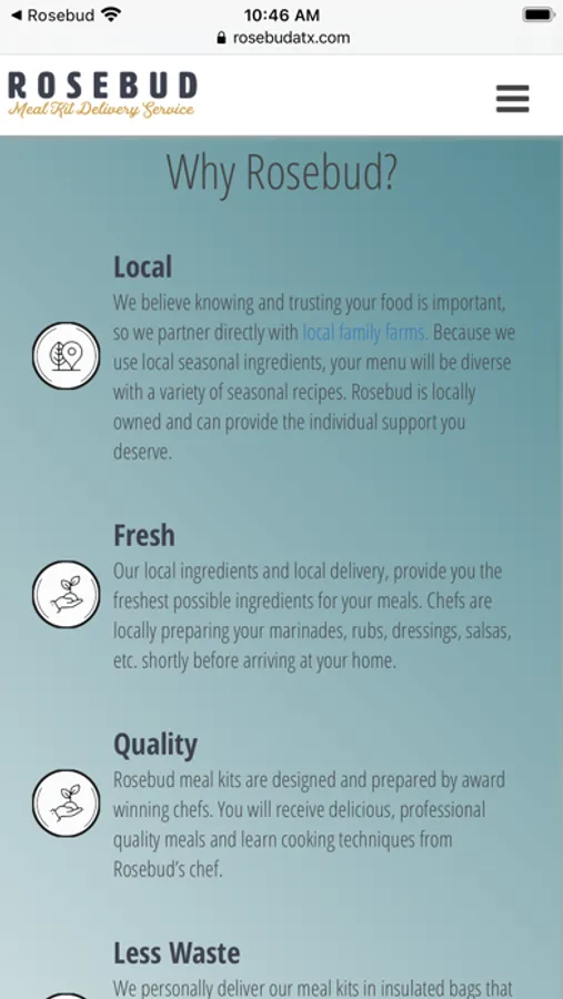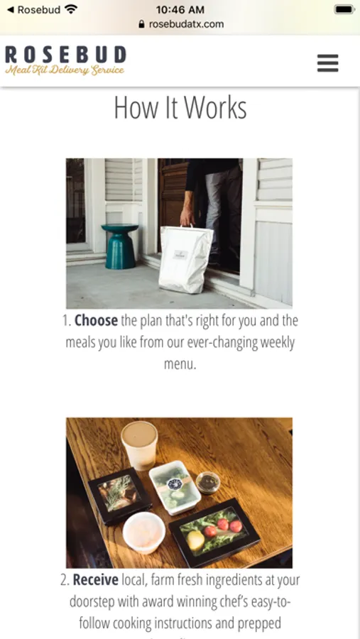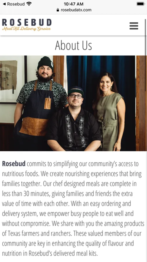 Rosebud is an Austin based meal kit subscription service that delivers chef prepared recipes with locally sourced ingredients partially or fully prepped. With the Rosebud app you can sign up for service, manage your meal plan and choose your weekly meals. Rosebud is committed to simplifying a family’s access to nutritious and flavorful meals. After receiving your hand delivered meal kit, you follow easy cooking instructions and avoid wasting money, making grocery lists and wasting leftovers. We value the power of food, the craft of our award winning chefs, our local farmers, and ease of accessibility for our customers.