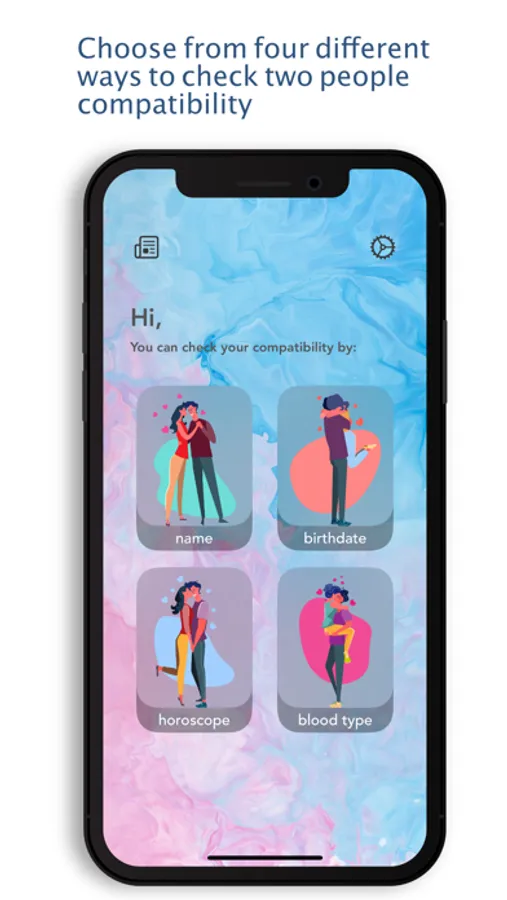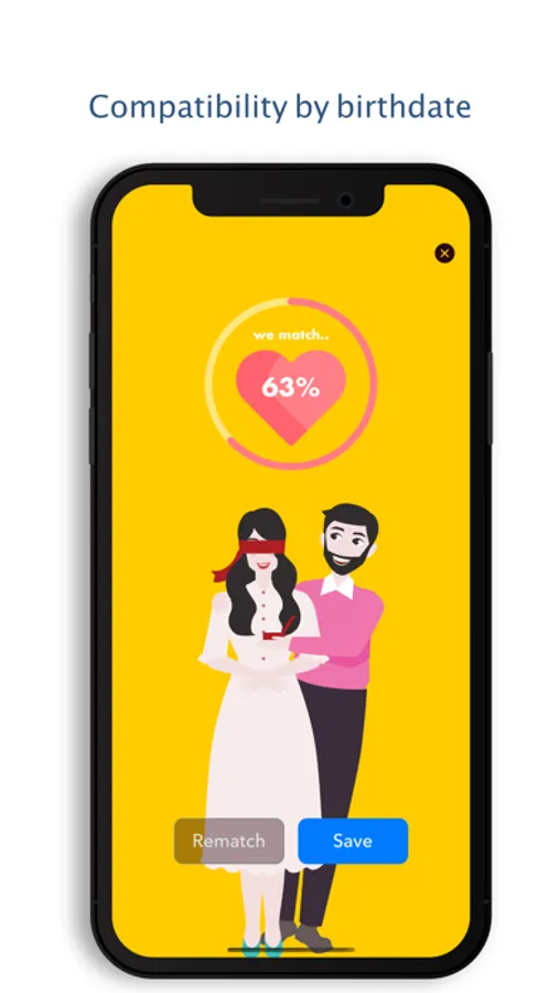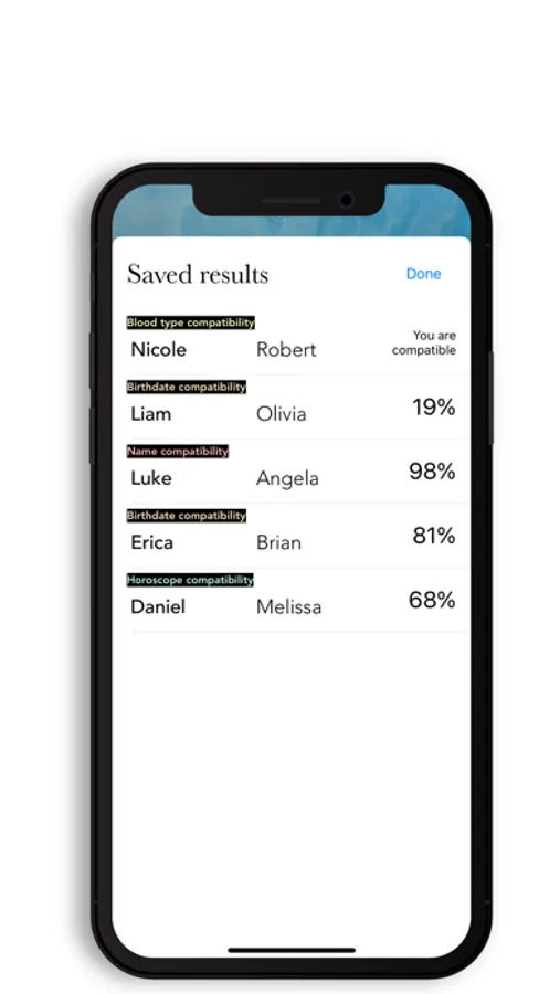 • Compatibility by name. Just enter yours and your partner names and get how many percent you match, how many percent match your safety, trust and communication.