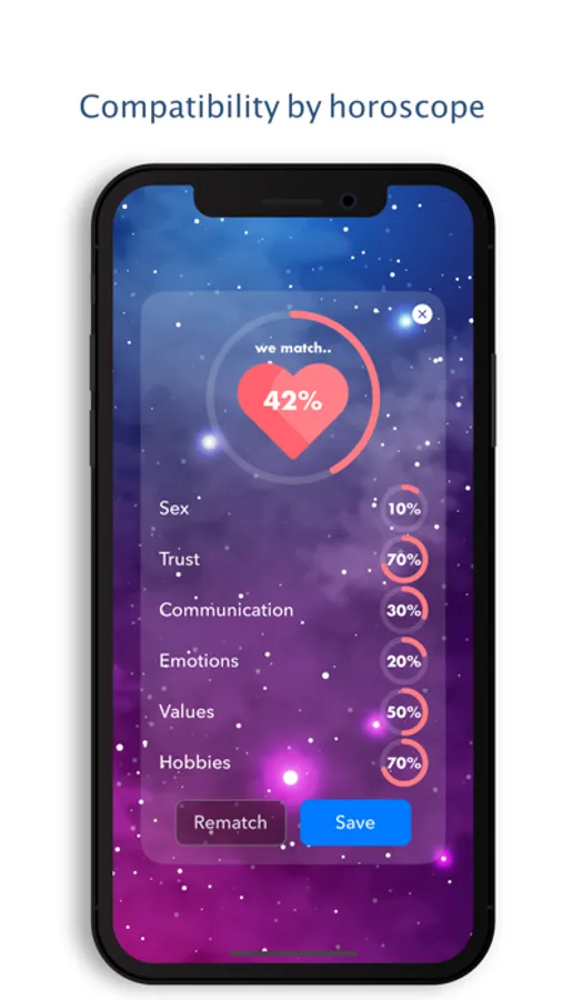 • Compatibility by horoscope. Pick yours and your partner horoscope and get how many percent you match, how many percent match your sex, trust, communication, emotions, values, hobbies.