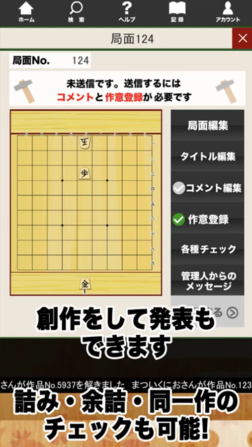 レベル7以上になると創作が可能になります。詰将棋を作って管理人に送ることができます。 余詰チェックなどの後採用通知が来ますので、もう一度採用してもいいかの判断ができます。ここで採用してよいなら「YES」ボタンを押下してください。