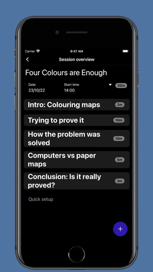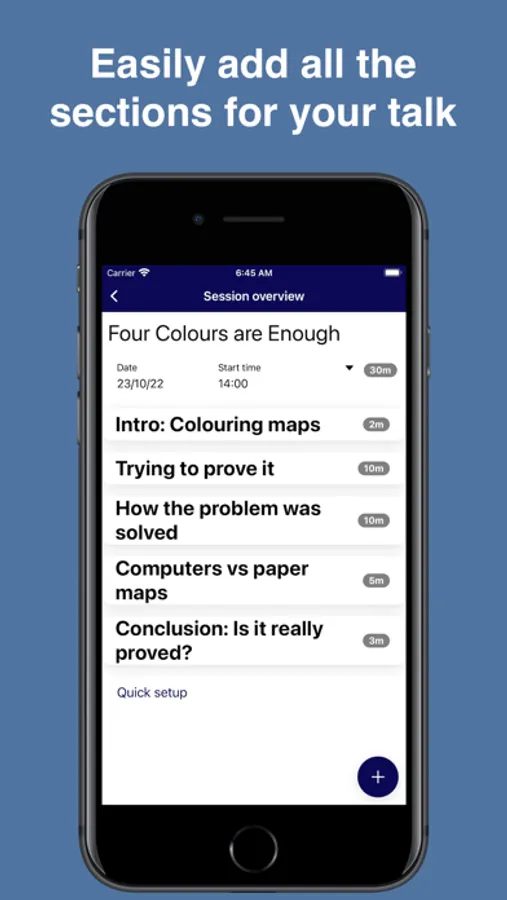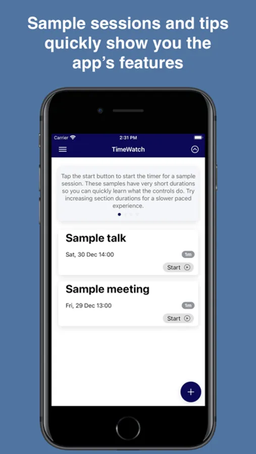 The free version of TimeWatch allows you to create and use just one session, for example to time one talk, presentation, meeting or lesson etc. You can change or edit this single session freely and as often as needed. You can also delete it and then create a different session. This may suit users who, for example, give a talk or teach a lesson only occasionally. If you choose to purchase a subscription to the pro version then you will be able to create multiple sessions. This may suit users who regularly give a number of different talks or teach many different lessons and would like to keep a timer for each one stored and ready to go in the TimeWatch app.