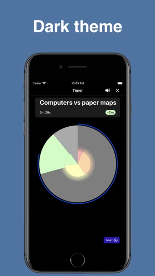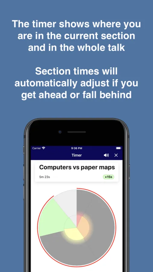 TimeWatch is specially designed to keep you on time as a public speaker. Use it as a talk timer, speech timer, presentation timer, lesson timer, or meeting timer. Instead of using just a basic clock or stopwatch for the whole session, use TimeWatch as a section timer that clearly shows progress and automatically makes timing adjustments to help you stay on time.