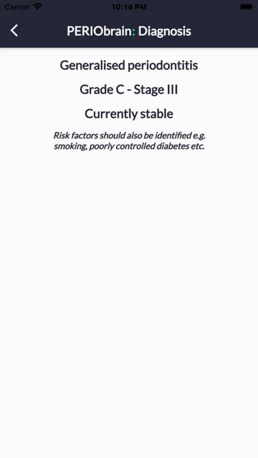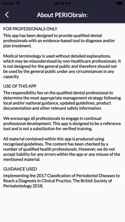 The Perio Brain app has been designed to provide qualified dental professionals with an evidence-based tool to diagnose and/or plan treatment. Medical terminology is introduced without detailed explanations, which may be misunderstood by non-healthcare professionals. It is not designed for the general public and therefore should not be used without first seeking advice from a dental professional.