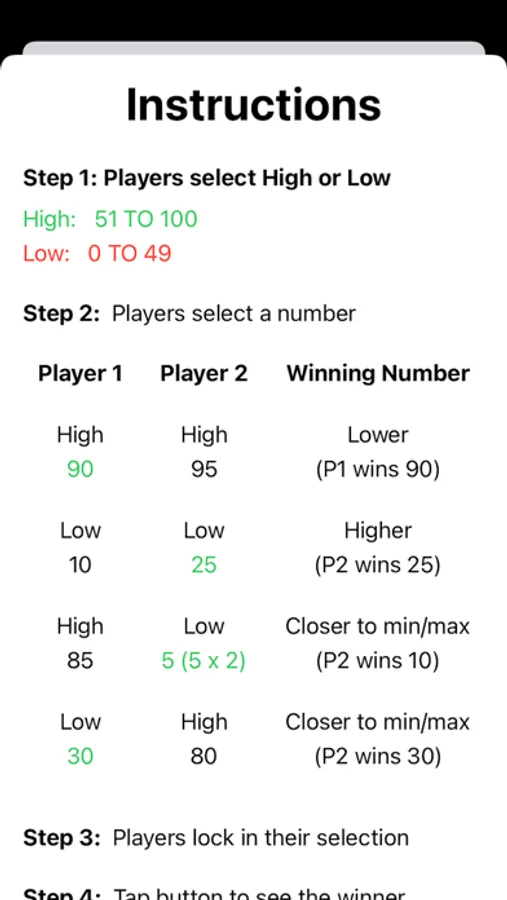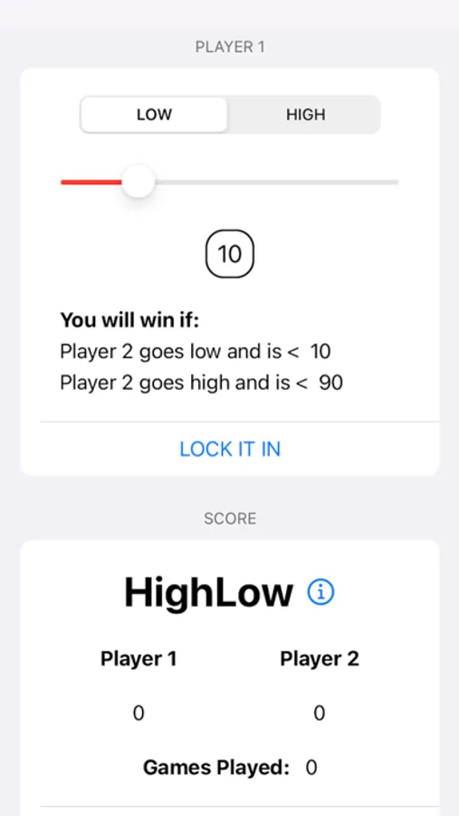 HighLow is a mind game. Much like rock, paper, scissors players compete against each other trying to guess the other players move. If both players select high numbers, the low number wins. If both players select low numbers, the high number wins. If one player selects a low number and one selects a high number, then the number closer to the respective min/max wins. There is great risk selecting a high number, but greater reward!