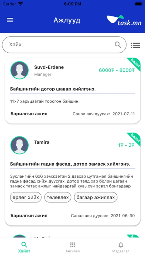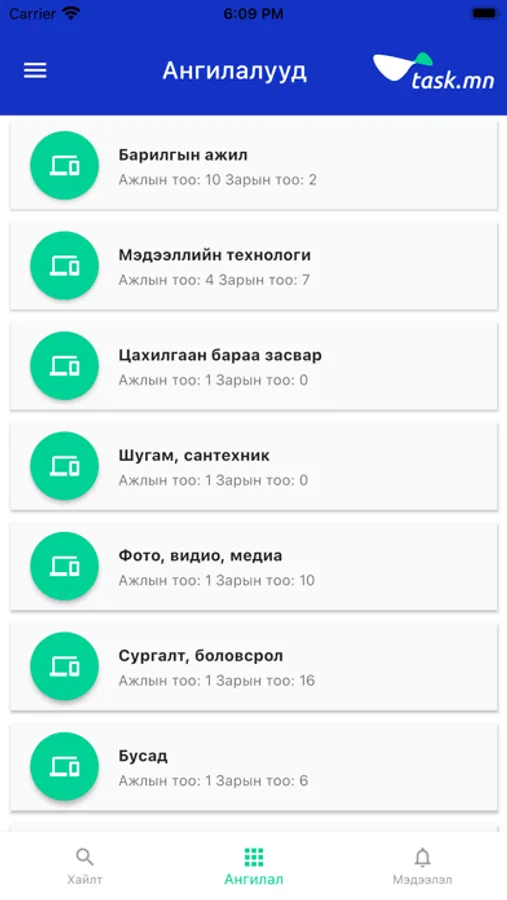 Task.mn нь захиалагч онлайнаар ажилчдыг хөлсөлж авч ажиллуулах боломжтой систем юм. Үүндээ зориулж төлбөр тооцоо хийх, гүйцэтгэлийг хянах, гэрээ байгуулах зэрэг бүх л үйлдлийг онлайнаар хийх боломжийг олгодог.