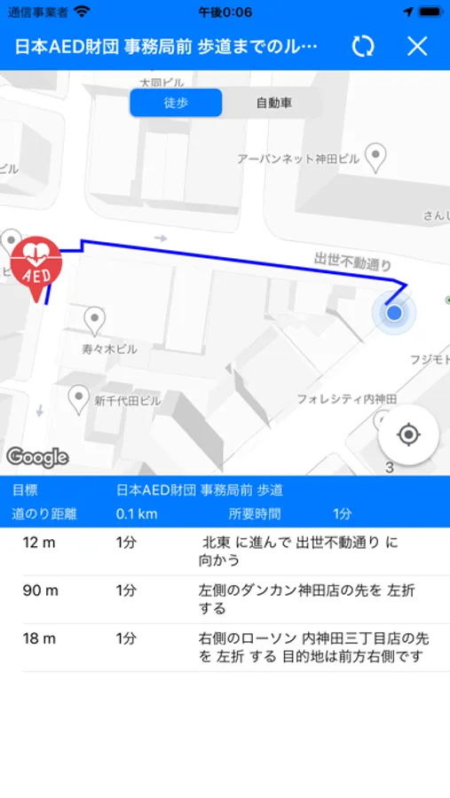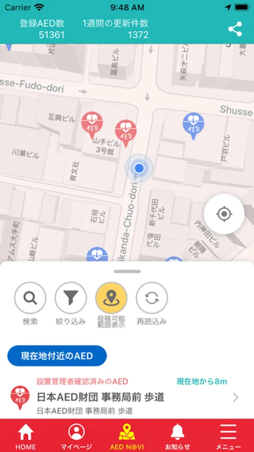 ・みんなでAEDの設置情報を集めるAED マップ「AED N@VI」。AEDまでのルート検索や、最寄りのAEDを表示する機能も搭載。