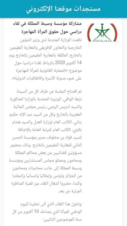 خدمة مستجدات موقعنا الإلكتوني: حيث تمكن هذه الخدمة من تصفح مختلف مستجدات وأنشطة مؤسسة وسيط المملكة عبر التطبيق والمتوفرة في موقعنا الإلكتروني: