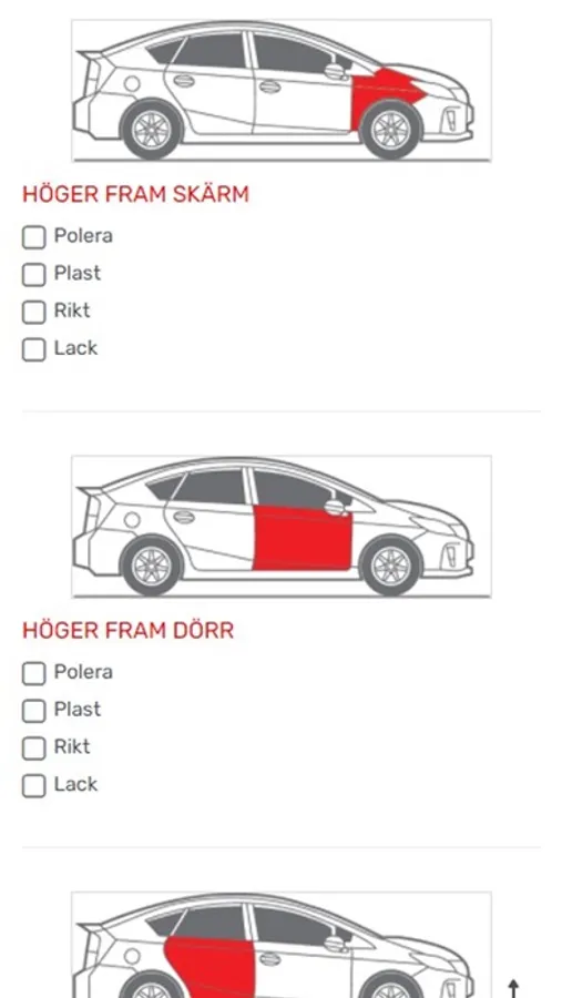 I vissa fall kan repor och skador uppstå i vissa delar av ditt fordon. Med formuläret du fyller i i denna ansökan kan vi noggrant undersöka alla kaross- och färgskador på ditt fordon och analysera i detalj vilka procedurer som krävs för reparation.