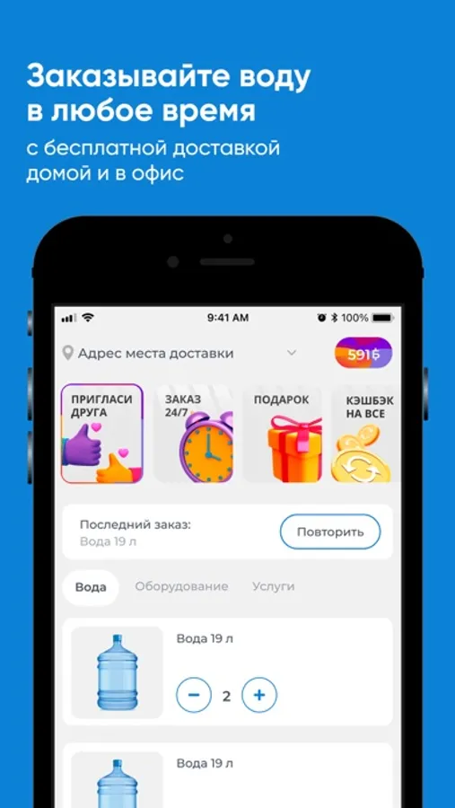 Скачайте приложение «AmAqua Калининград» на свой смартфон и делайте заказ воды 24/7. Вы сможете повторять заказ нажатием одной кнопки, оплачивать покупки онлайн, видеть всю историю покупок и быть в курсе всех акций компании.